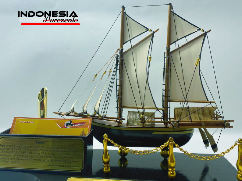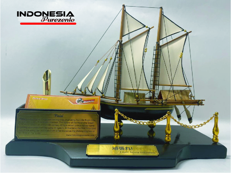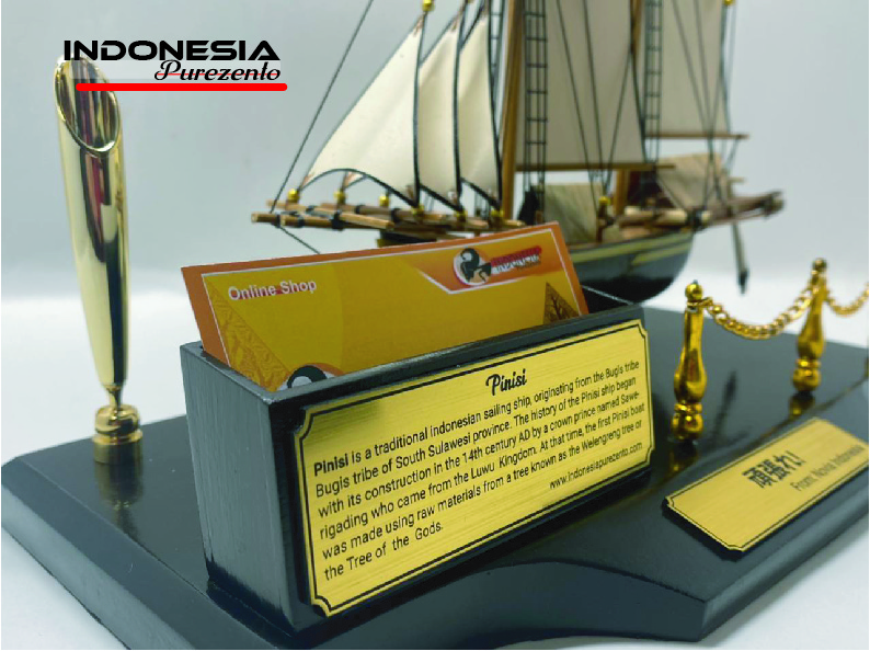 Miniatur kapal pinisi ini adalah replika dari kapal layar tradisional khas milik Indonesia, yang berasal dari suku Bugis dari provinsi Sulawesi Selatan. Tujuh helai layar memiliki makna kalau nenek moyang bangsa Indonesia mampu mengarungi tujuh samudera besar di dunia. Bukan hanya sebagai cindramata miniatur kapal layar ini di lengkapi dengan pen holder dan tempat kartunama sehingga sangat berguna sekali buat meja pajangan kantor.